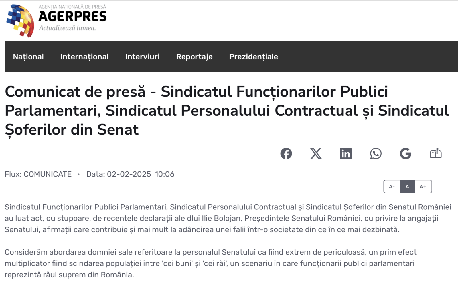 Sindicatul Funcționarilor Publici Parlamentari, Sindicatul Personalului Contractual și Sindicatul Șoferilor din Senatul României au luat act, cu stupoare, de recentele declarații ale dlui Ilie Bolojan, Președintele Senatului României, cu privire la angajații Senatului, afirmații care contribuie și mai mult la adâncirea unei falii într-o societate din ce în ce mai dezbinată.
